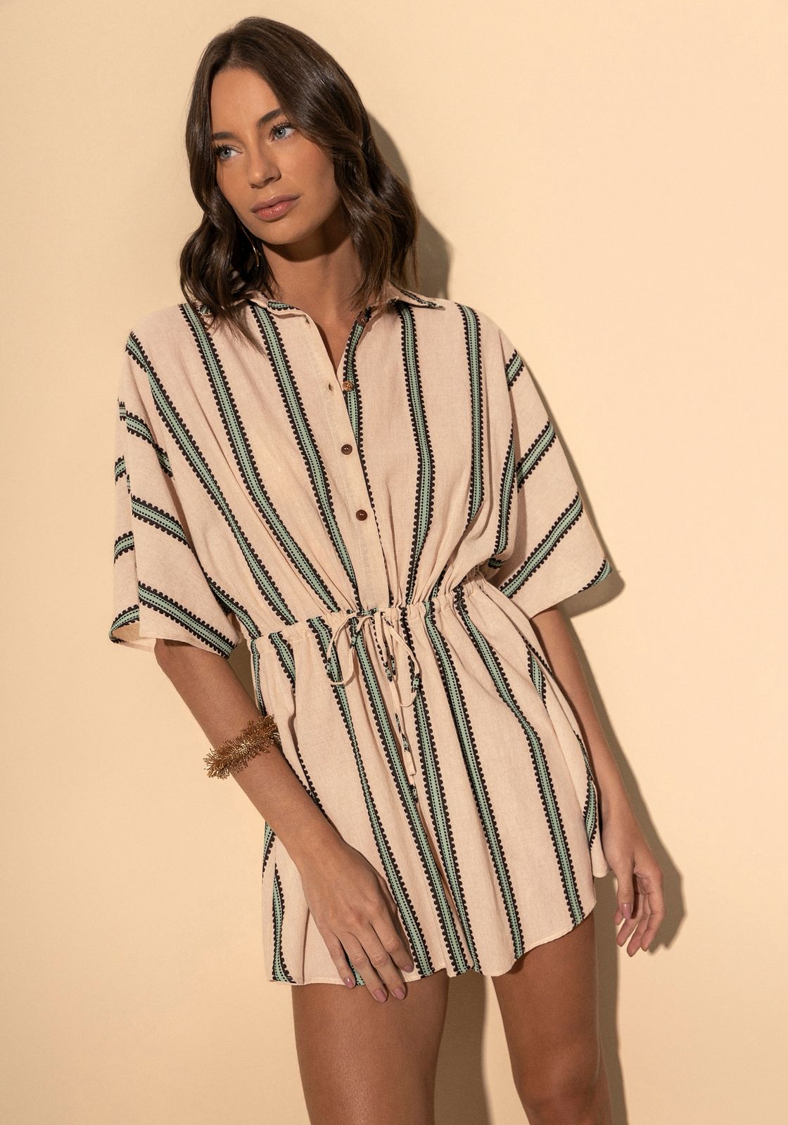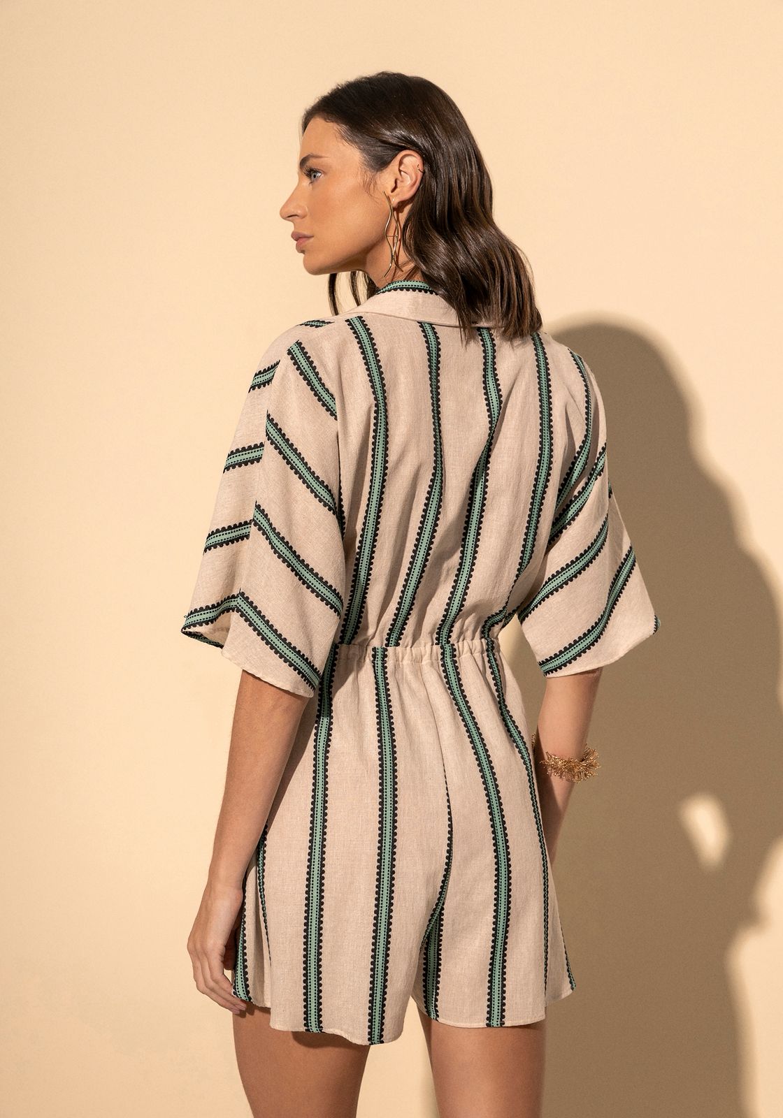 Leve e descomplicado, o macacão curto com shape solto apresenta uma padronagem moderna que confere um toque único ao visual. A amarração na cintura permite ajustar o caimento e definir a silhueta de forma elegante.