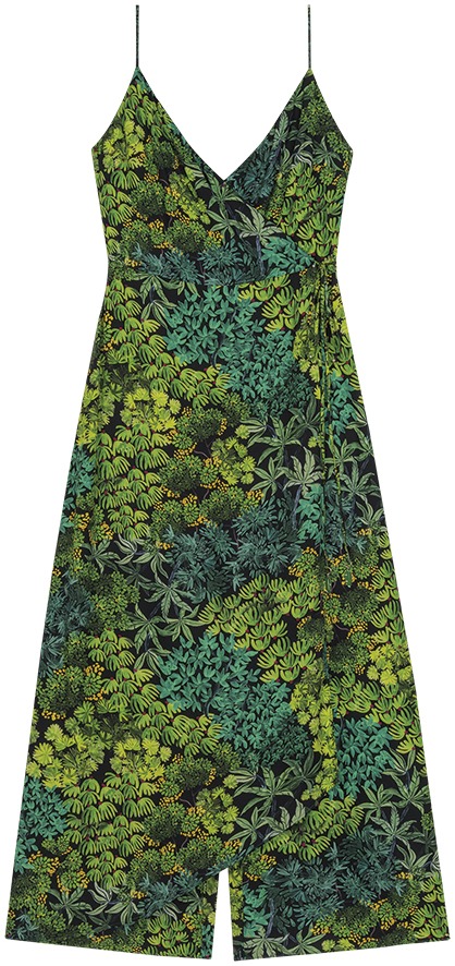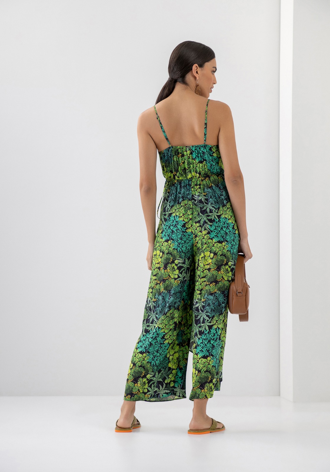 Macacão midi em viscose que fará você se sentir envolvida pela natureza em cada movimento. Sua estampa inspirada nas florestas brasileiras traz a energia da fauna e flora para o seu look. Com modelagem transpassada e alças, cria um movimento sofisticado no corpo, perfeito para combinar com sandália de tiras.