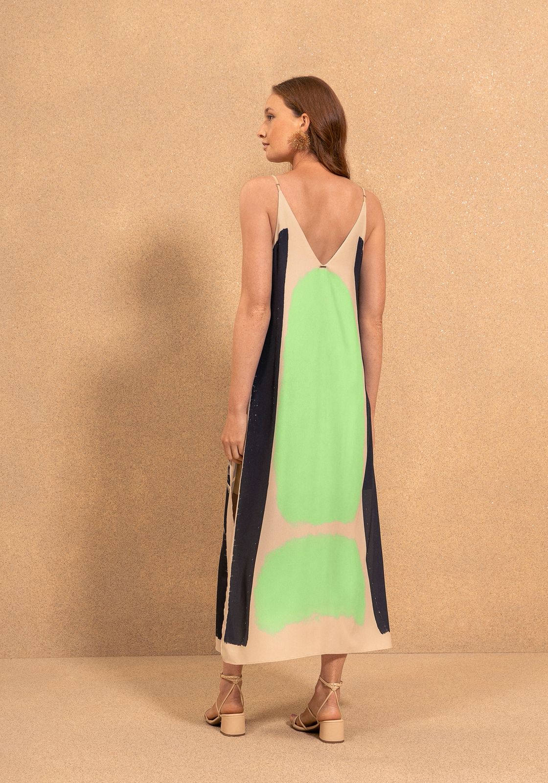 O vestido de alças estampado em tecido que não amassa revela o equilíbrio ideal entre elegância e praticidade. Elementos delicados, como o decote em V, se aliam ao caimento leve, oferecendo um visual repleto de charme.