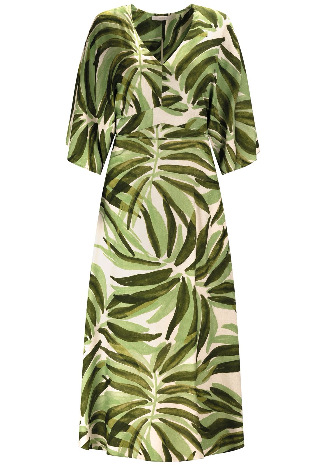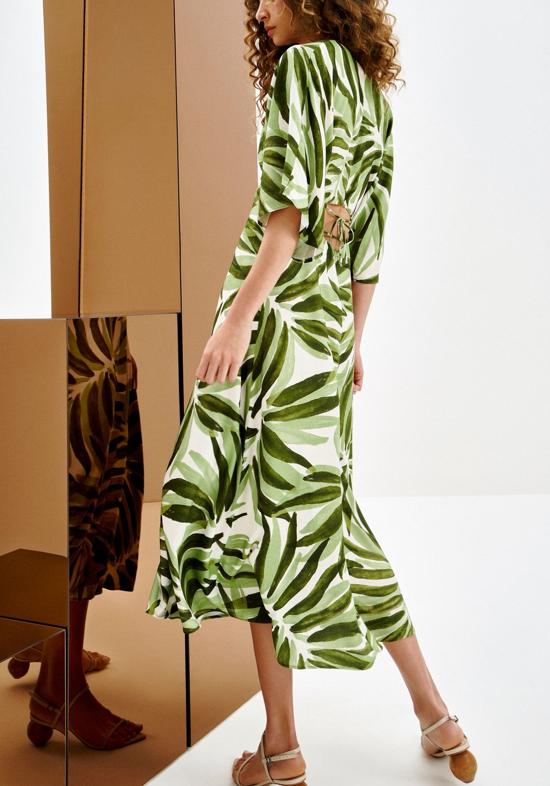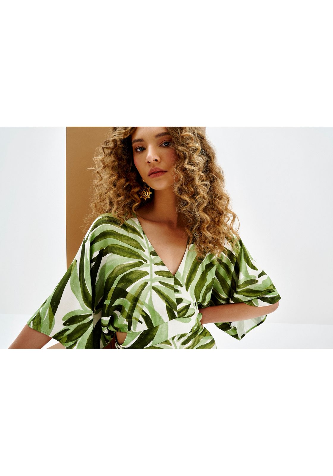 Confeccionado em Tecido Rayon Twill, viscose mais encorpada com leve textura. Peça da Coleção Íris com modelagem reta, cintura marcada com cut e amarração transpassada nas costas, mangas 3/4 flare, fechamento por zíper nas costas e estampa rotativa