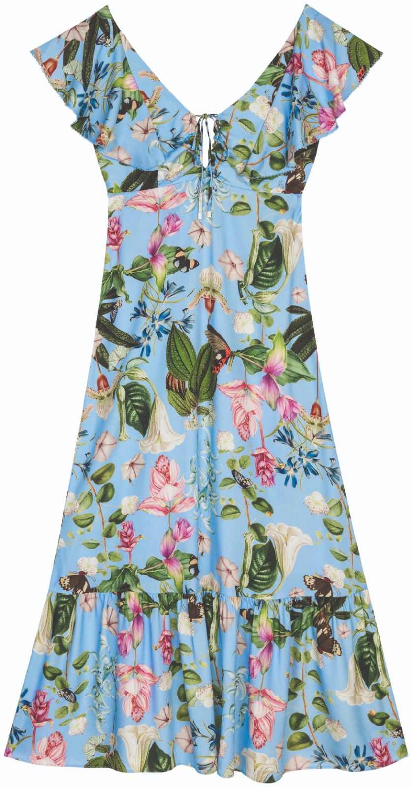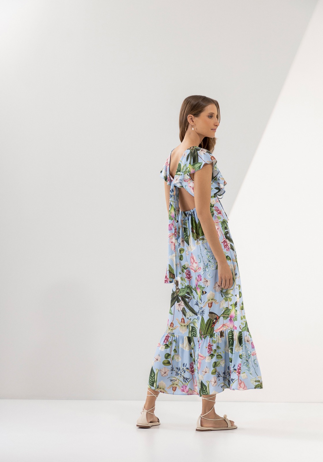 Vestido midi com caimento fluido, em que o caminhar se transforma em uma dança de leveza. Os detalhes – como os babados e as amarrações – adornam a peça em um conceito romântico. Como complemento, a estampa inspirada nas Filipinas desperta uma paleta de cores suaves que combina perfeitamente com bolsa em tons de laranja ou rosa.